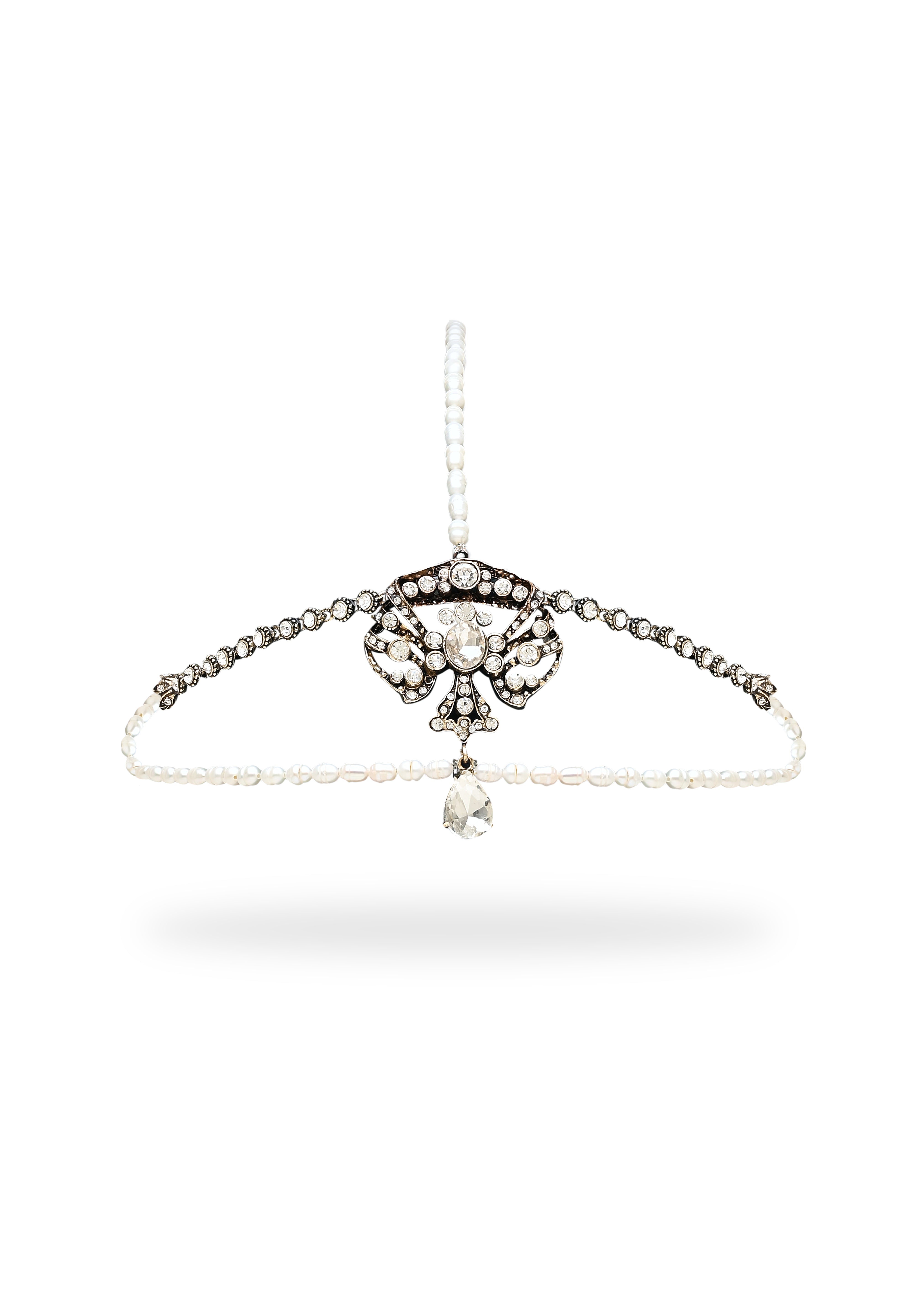 - Made of antique plated brass, crystals and natural pearls.
